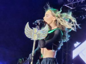 Pasadas las 9 pm la cantante salío al escenario para comenzar su show ante más de 30 mil asistentes en la FNSM 2023. Temas que la han colocado en el gusto del público atravez de los años, estuvieron presentes.  Temas de telenovelas que protagonizó a inicios de su carrera artística, como “Amigos por siempre”, “Cómplices al rescate”,  no pueden faltar en sus conciertos ya que su público siempre los pide. Adémas de temas como “Muriendo lento”, “Bella traición”, “Egoísta”, “Si no te quisiera”, “Luz sin gravedad”, “Ángel”, entre otros.