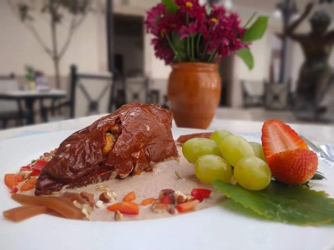 Cada uno de sus ingredientes está ligado a la identidad e historia de Aguascalientes; la estrella del platillo es un chile seco, uno de los principales cultivos de Rincón de Romos; en una mezcla de piloncillo y otras especias; y el cual está relleno de carne molida de res y cerdo sumergida en uva pasa, en alusión a la ganadería; mientras que la nogada es elaborada con almendras y licor de guayaba, el gran sabor de Calvillo.
