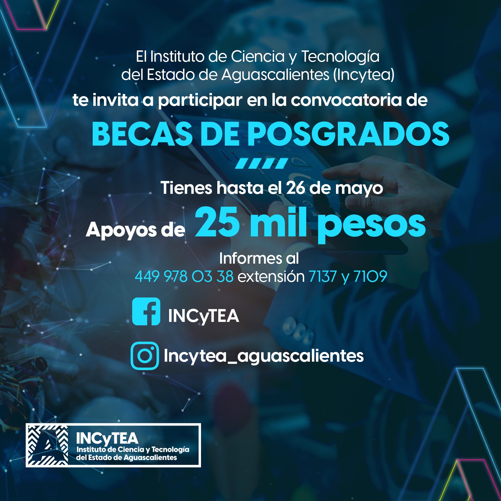 Los requisitos de la convocatoria se pueden consultar en la página www.aguascalientes.gob.mx/incytea. Para mayores informes, comunicarse al 449 963 86 33 extensiones 7109 y 7137, en un horario de 8:30 a 15:00 horas, así como en las redes sociales del instituto: en Facebook INCyTEA y en Instagram incytea_aguascalientes.