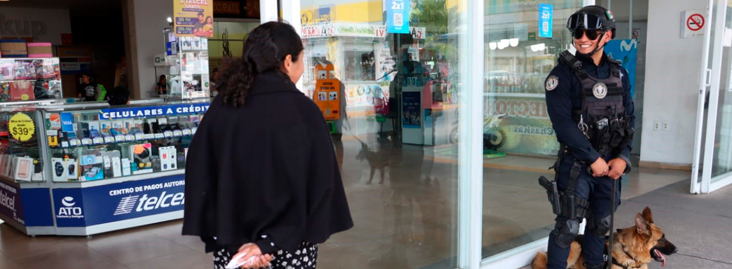 Con el propósito de brindar seguridad a las personas que asisten a los centros comerciales y a empleados y propietarios de negocios, la Secretaría de Seguridad Pública Municipal de Aguascalientes (SSPM) como parte del operativo Barrio Seguro, realiza recorridos de vigilancia de manera permanente en dichas zonas, fortaleciendo así la proximidad social y la prevención del delito mediante la participación de binomios caninos del Grupo K9.