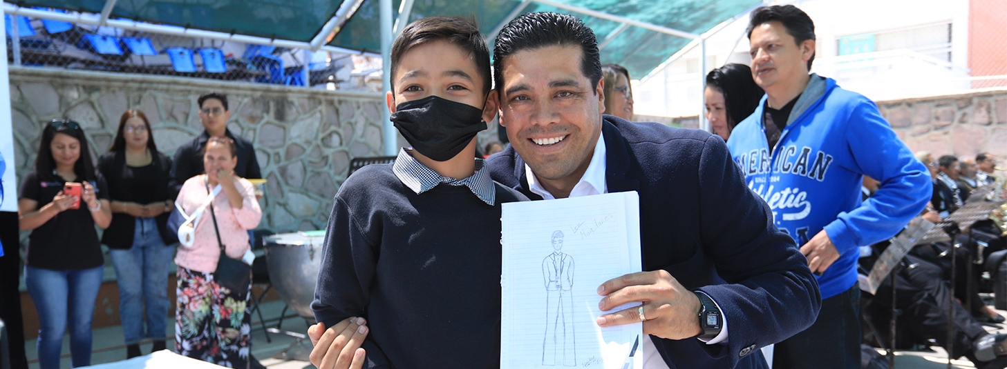 Acompañado por Juan Pablo Gómez Diosdado, contralor de Gobierno del Estado y del titular de la Secretaría de Obras Públicas Municipales, Miguel Ángel Huízar Botello entregaron una tablet a los niños con mejor promedio, Luisa María Columbia Morán Castillo, Jade Yadtziri García de la Rosa e Iker Axel Licona Ramos, además de un kit deportivo para la escuela primaria.