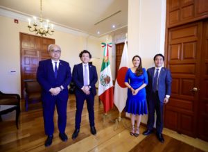 Al reunirse con los empresarios William Chin, Rikiya Iwase y Oshima Shinichiro, la gobernadora de Aguascalientes, Tere Jiménez, les presentó algunos de los proyectos estratégicos que impulsa su administración para fortalecer a la industria local y generar nuevas inversiones.