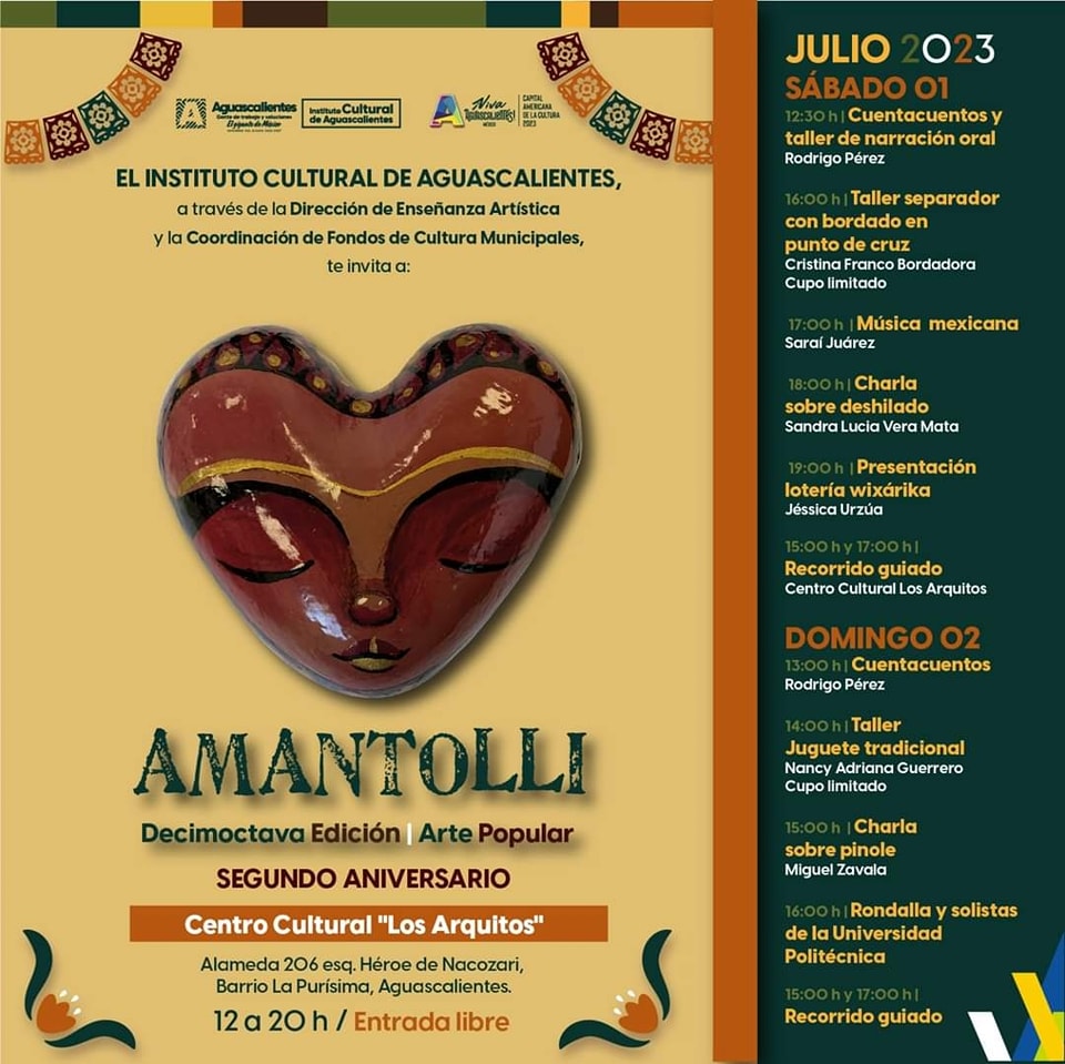 AMANTOLLI es un espacio para la venta y exposición de artesanías elaboradas en el estado de Aguascalientes, se ofrecen también talleres, charlas, platillos tradicionales, además de la presentación de cuentacuentos, recorridos por el centro cultural y música en vivo.