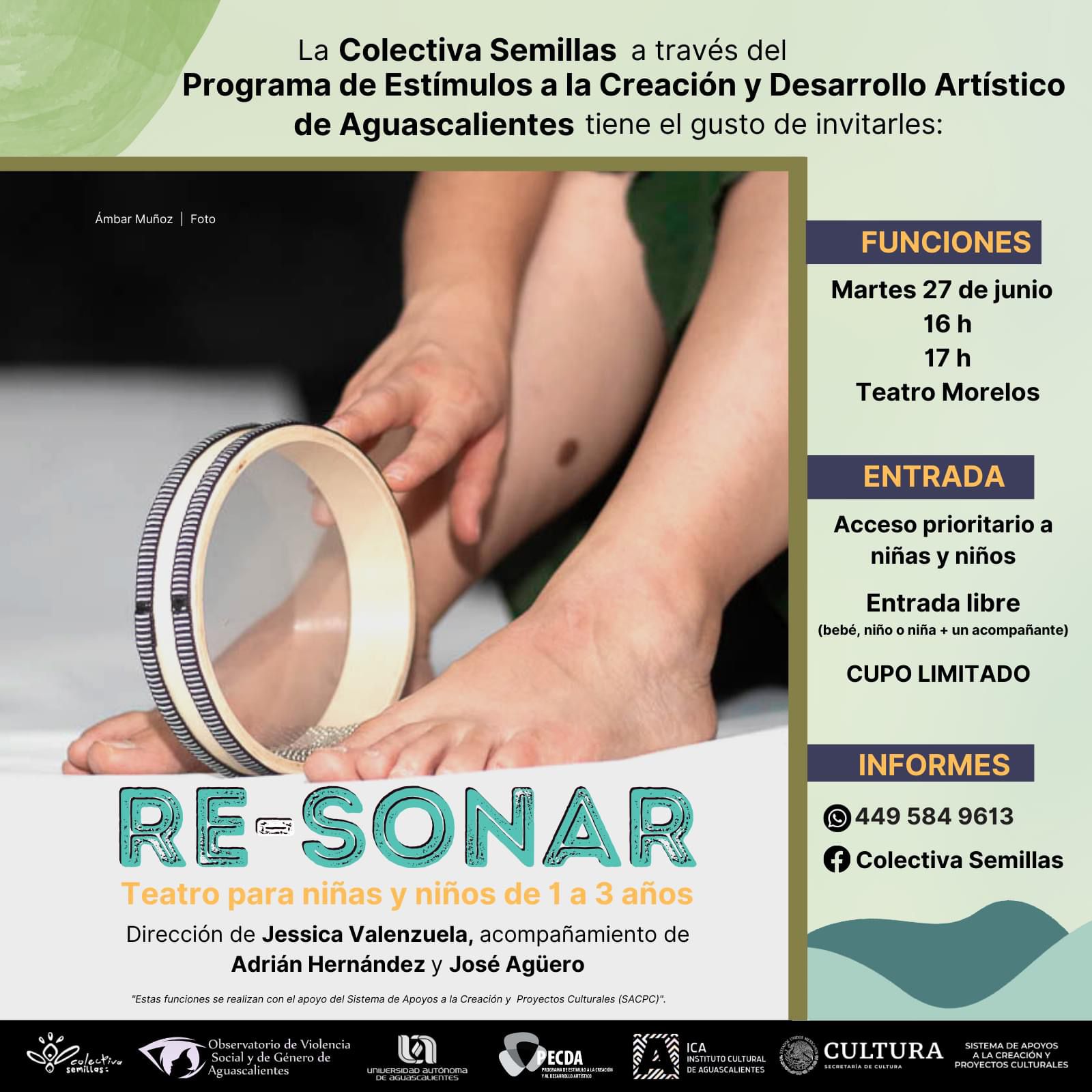 Nuestros amigos de la Colectiva Semillas nos invitan al “Teatro para niñas y niños de 1 a 3 años”. El martes 27 de junio 16 y 17h en el Teatro Morelos Aguascalientes.