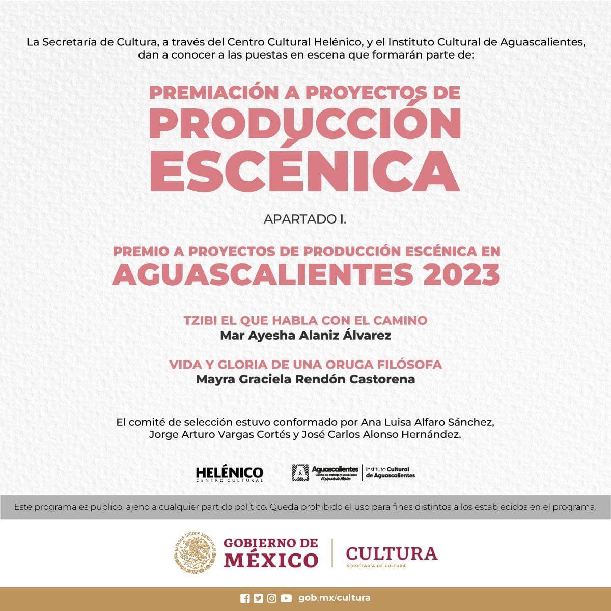 Te invitamos a conocer las puestas en escena que formarán parte de la “Premiación a proyectos de producción escénica en Aguascalientes 2023” 🤩