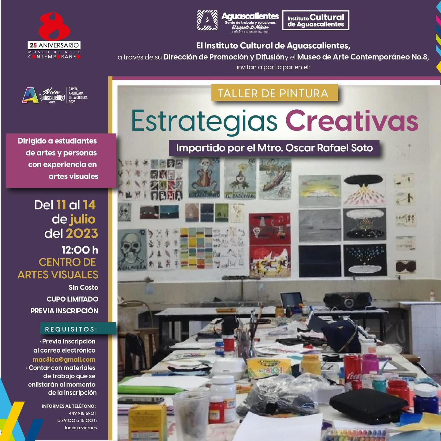 Te invitamos al taller de pintura “Estrategias creativas”, del 11 al 14 de julio, que será impartido por el Mtro. Óscar Rafael Soto; está dirigido a estudiantes de artes y personas con experiencia en artes visuales.