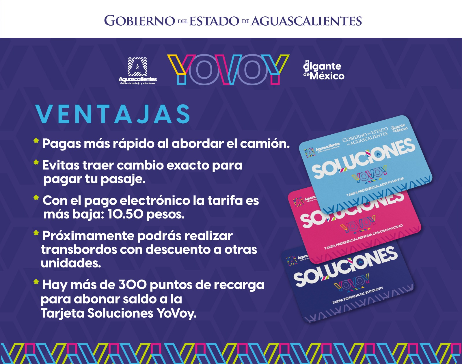 La Coordinación General de Movilidad (CMOV) invita a la ciudadanía a adquirir la Tarjeta Soluciones YoVoy para el pago electrónico, con la que los usuarios podrán acceder a una tarifa más baja al pagar el transporte público (10.50 pesos) y con la que a su vez se agiliza el abordaje.