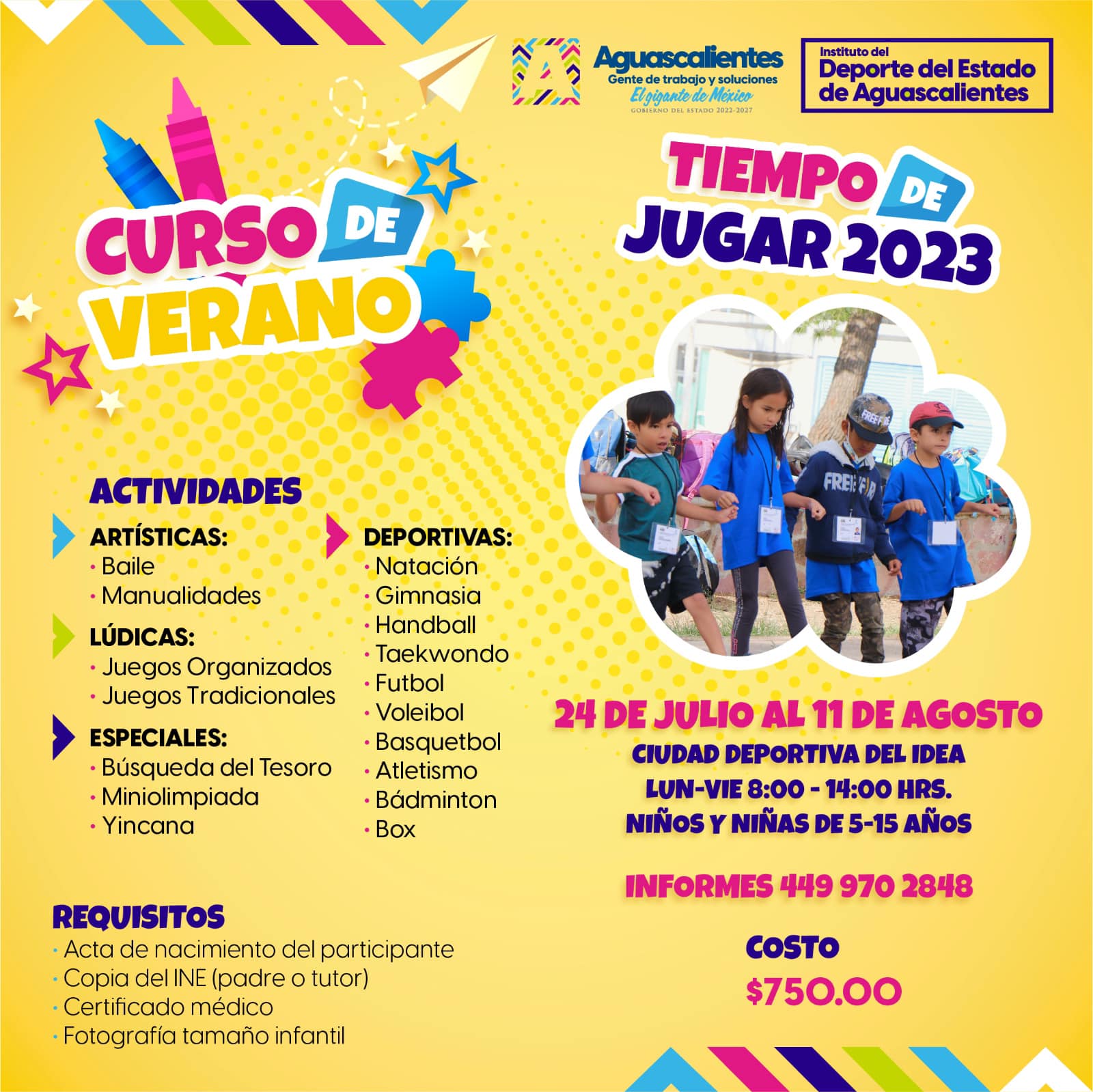 Con el objetivo de que las niñas, niños y jóvenes de Aguascalientes disfruten sus vacaciones, y en respuesta a la gran participación en los diferentes cursos de verano, el Instituto del Deporte del Estado de Aguascalientes (IDEA) puso en marcha un nuevo curso de verano “Tiempo de Jugar 2023”, que se llevará a cabo del 24 de julio al 11 de agosto en las instalaciones de la Ciudad Deportiva del IDEA.