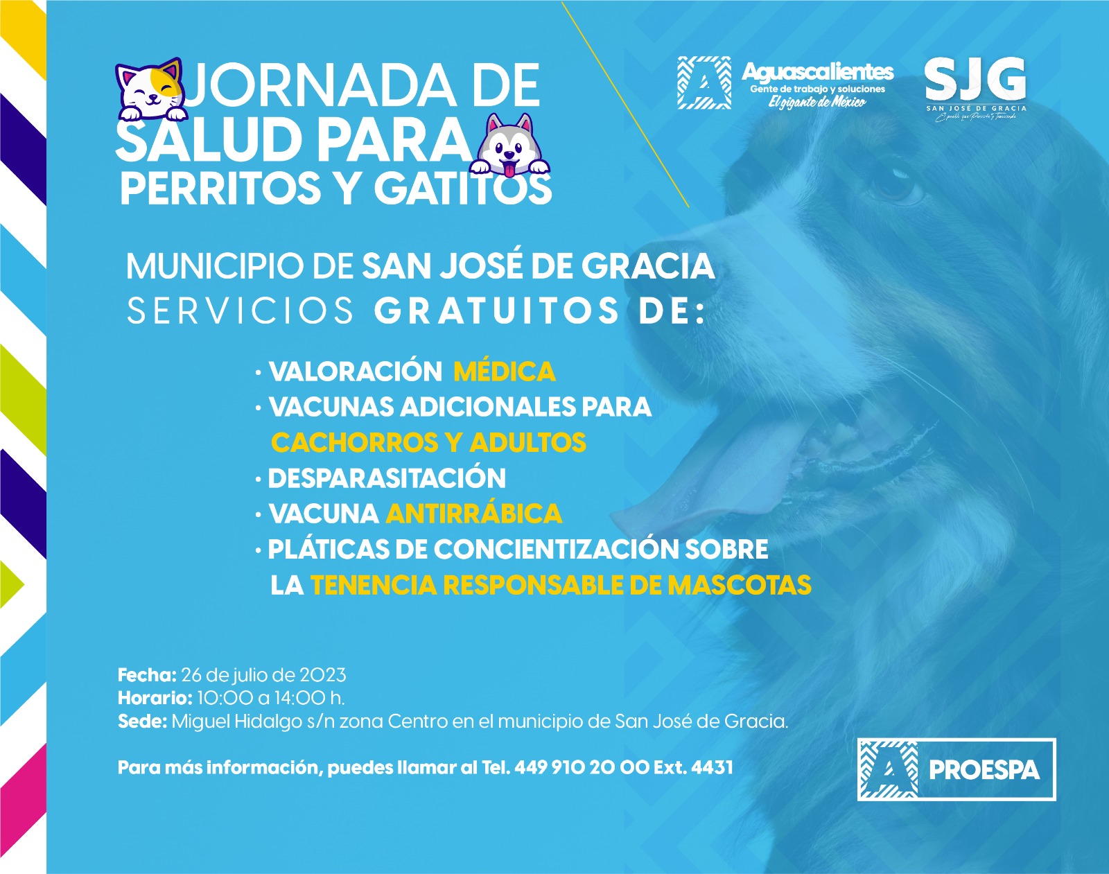 La Procuraduría Estatal de Protección al Ambiente (Proespa), invita a las y los propietarios de mascotas a participar en la Jornada de Salud para perritos y gatitos, el próximo miércoles 26 julio en el municipio de San José de Gracia.