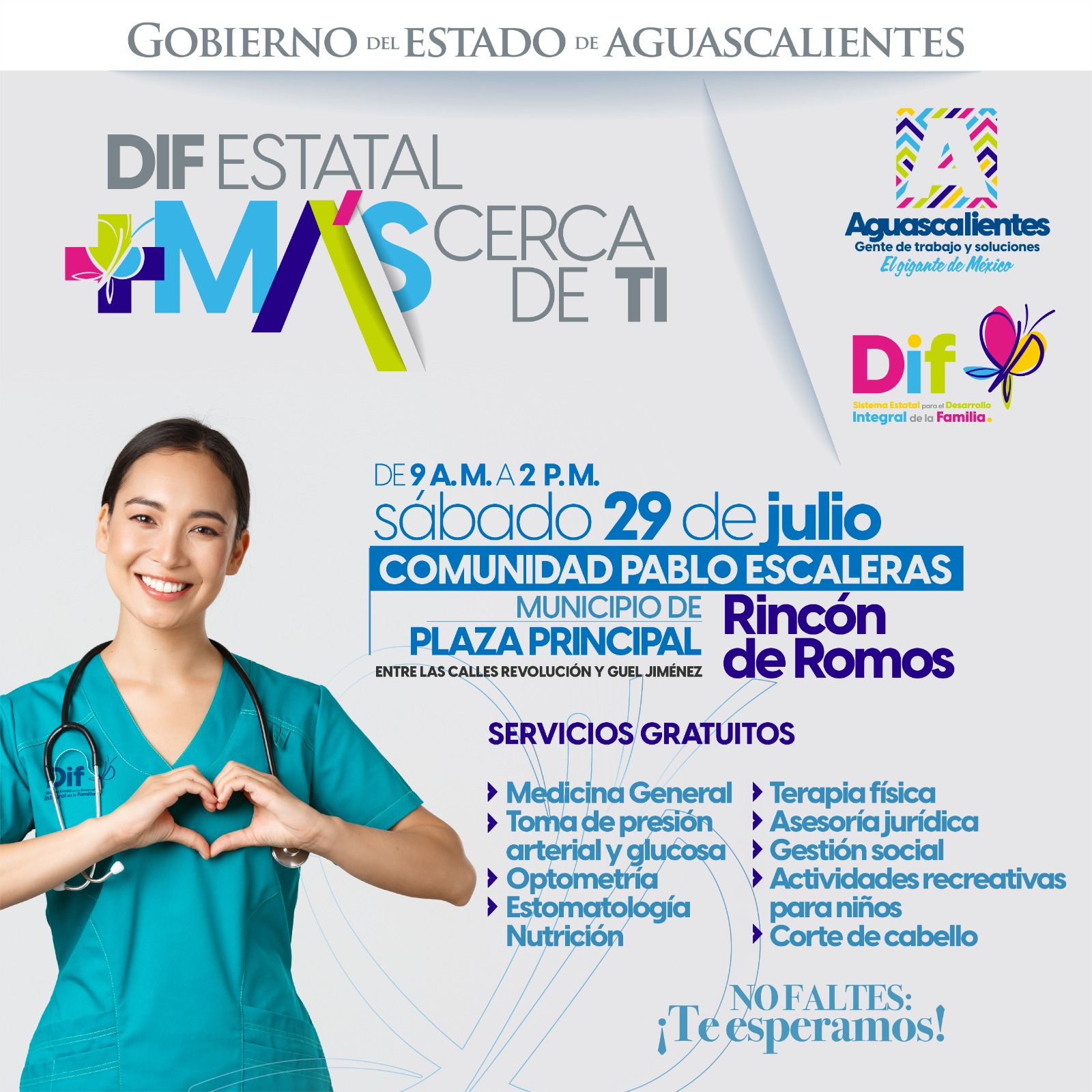 Este sábado 29 de julio estaremos Más Cerca De Tí en la plaza principal del municipio de Rincón de Romos a partir de las 9:00 horas.