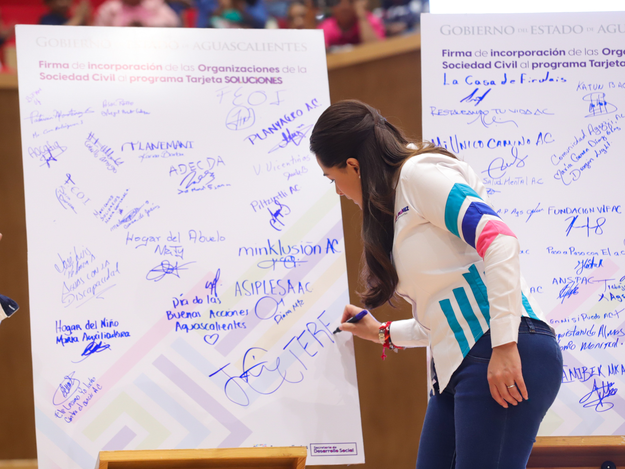 La gobernadora de Aguascalientes, Tere Jiménez, firmó un convenio de colaboración con más de 200 organizaciones de la sociedad civil (OSC), las cuales suman sus servicios a los beneficios que ofrece la Tarjeta Soluciones a la población.