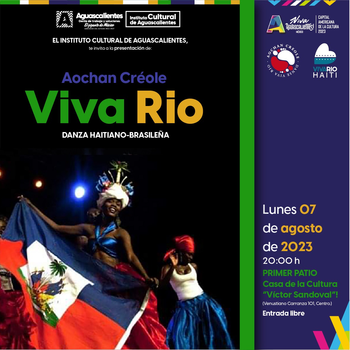 Ven a la presentación de Aochan Creole Danse Haiti “Viva Rio” Danza Haitiano-Brasileña, que será el lunes 7 de agosto a las 20 h en el primer patio de la Casa de la Cultura “Victor Sandoval”. ![]()