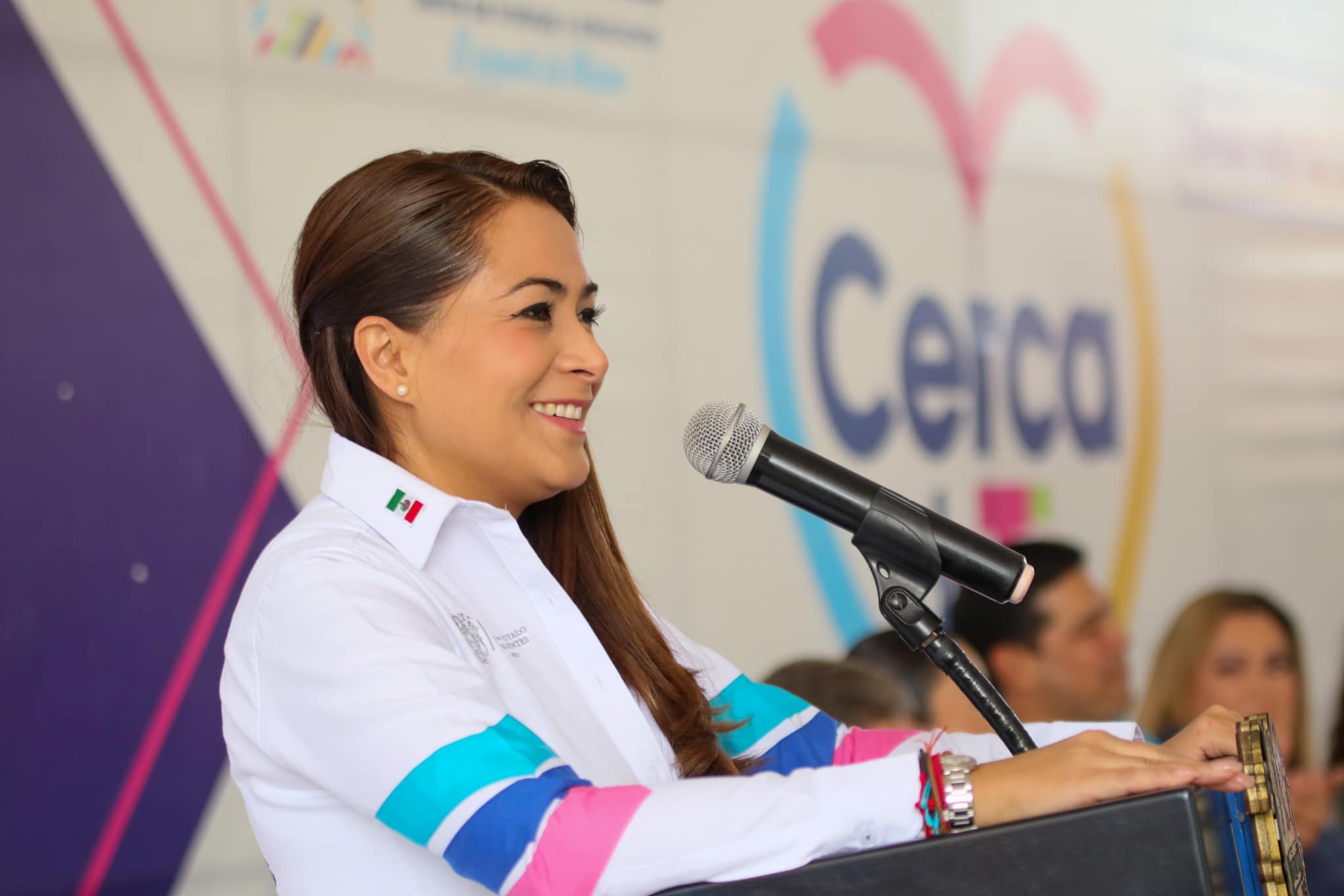 En el evento también estuvieron presentes la primera voluntaria y presidenta del DIF Estatal, Aurora Jiménez Esquivel; la diputada Mayra Guadalupe Torres Mercado; el secretario de Salud del estado, Rubén Galaviz Tristán; el director del Instituto Estatal de la Beneficencia Pública, José Antonio Abad Mena; el director general de la Línea Verde, Omar Valdez; la secretaria general de la Delegación de los 57, Martha Élida López Dávila; el director de la Escuela Secundaria Técnica No. 26, René Villalpando Salas, y la alumna de esta institución educativa, Yuliana Noemí Gutiérrez Chávez.