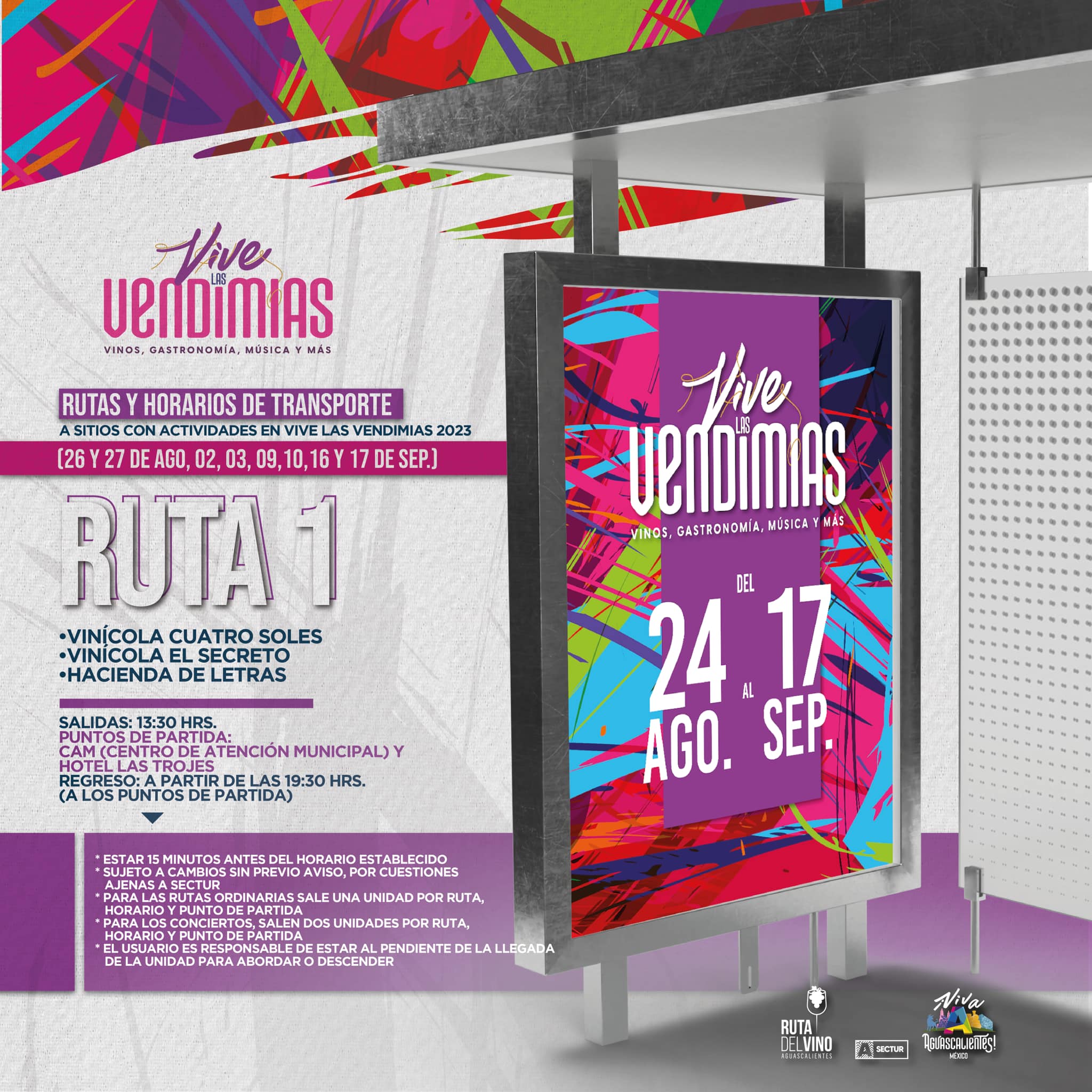 La Secretaría de Turismo de Aguascalientes (Sectur) dio a conocer que todos los sábados y domingos del 24 de agosto al 17 de septiembre se ofrecerá transporte gratuito a diferentes locaciones de “Vive las Vendimias 2023” de la Ruta del Vino.