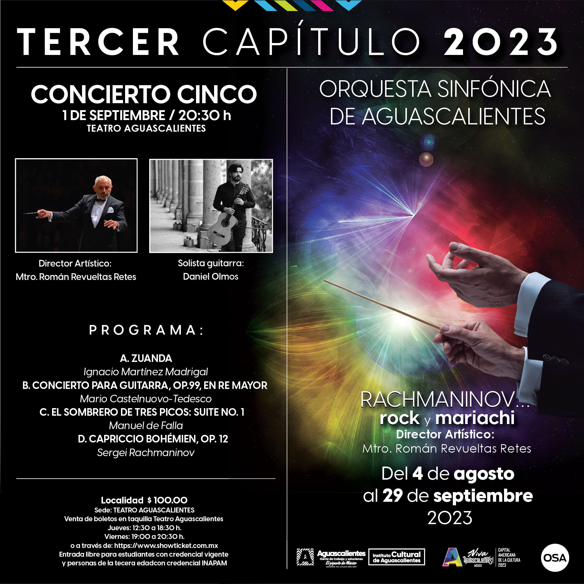 Te esperamos el viernes 1 de septiembre a las 20:30h en el Teatro Aguascalientes al concierto QUINTO del Tercer capítulo de la Orquesta Sinfónica de Aguascalientes, Rachmaninov… rock y mariachi. ![]()