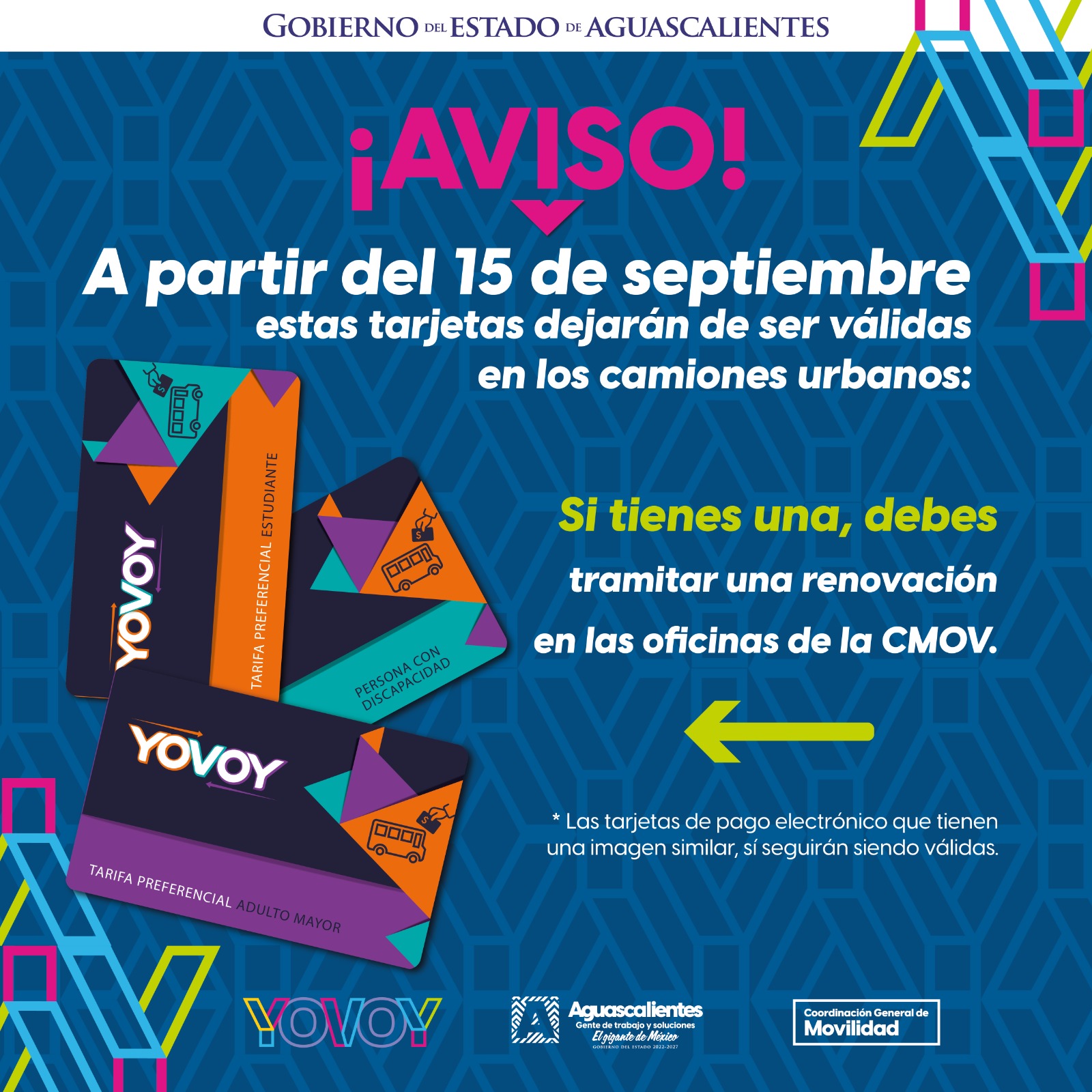 La Tarjeta YoVoy para adultos mayores, estudiantes y personas con discapacidad, cuyo diseño presenta triángulos en tonos azul aqua, morado y naranja, dejará de ser válida en los camiones urbanos a partir del 15 de septiembre.