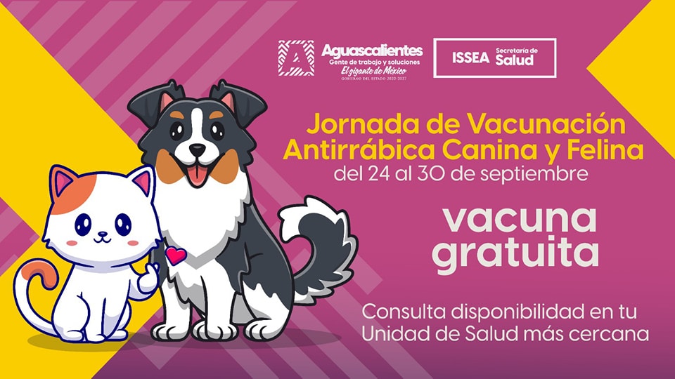 Tendremos una semana de vacunación antirrábica canina y felina del 24 al 30 de septiembre de 2023 en todos los Centros de Salud del estado de Aguascalientes.