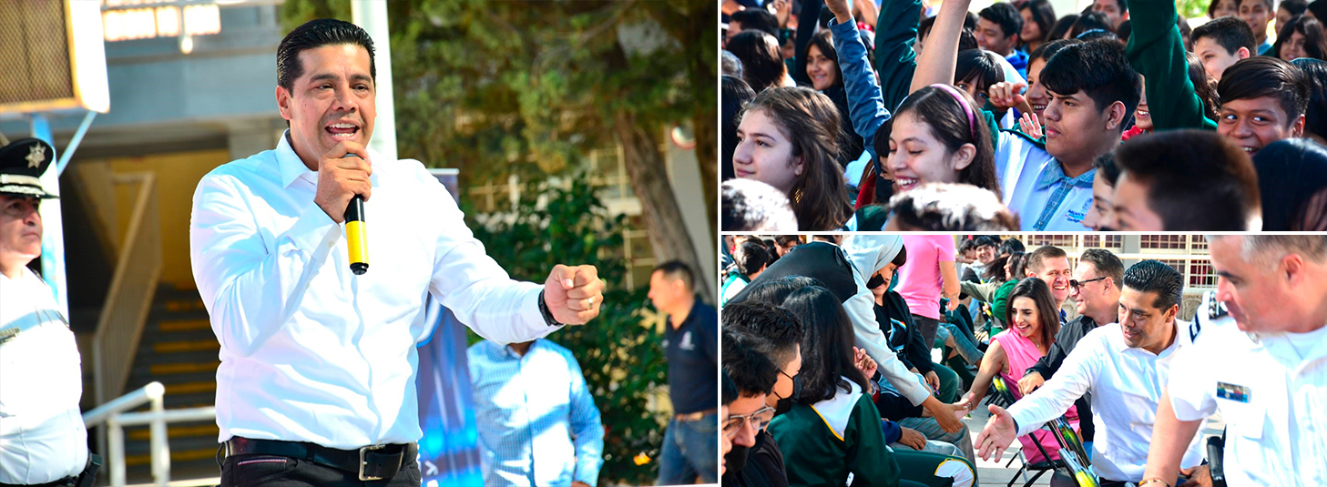 El presidente municipal, Leo Montañez, visitó la Escuela Secundaria General No. 32 “Jesús Aguilera Palomino”, para participar en la presentación del programa “Alejado de Riesgos”, impulsado por la regidora Alejandra Peña y que tiene por objetivo sensibilizar y concientizar a los jóvenes y adolescentes sobre los daños que ocasiona el consumo de sustancias ilícitas y malas decisiones.