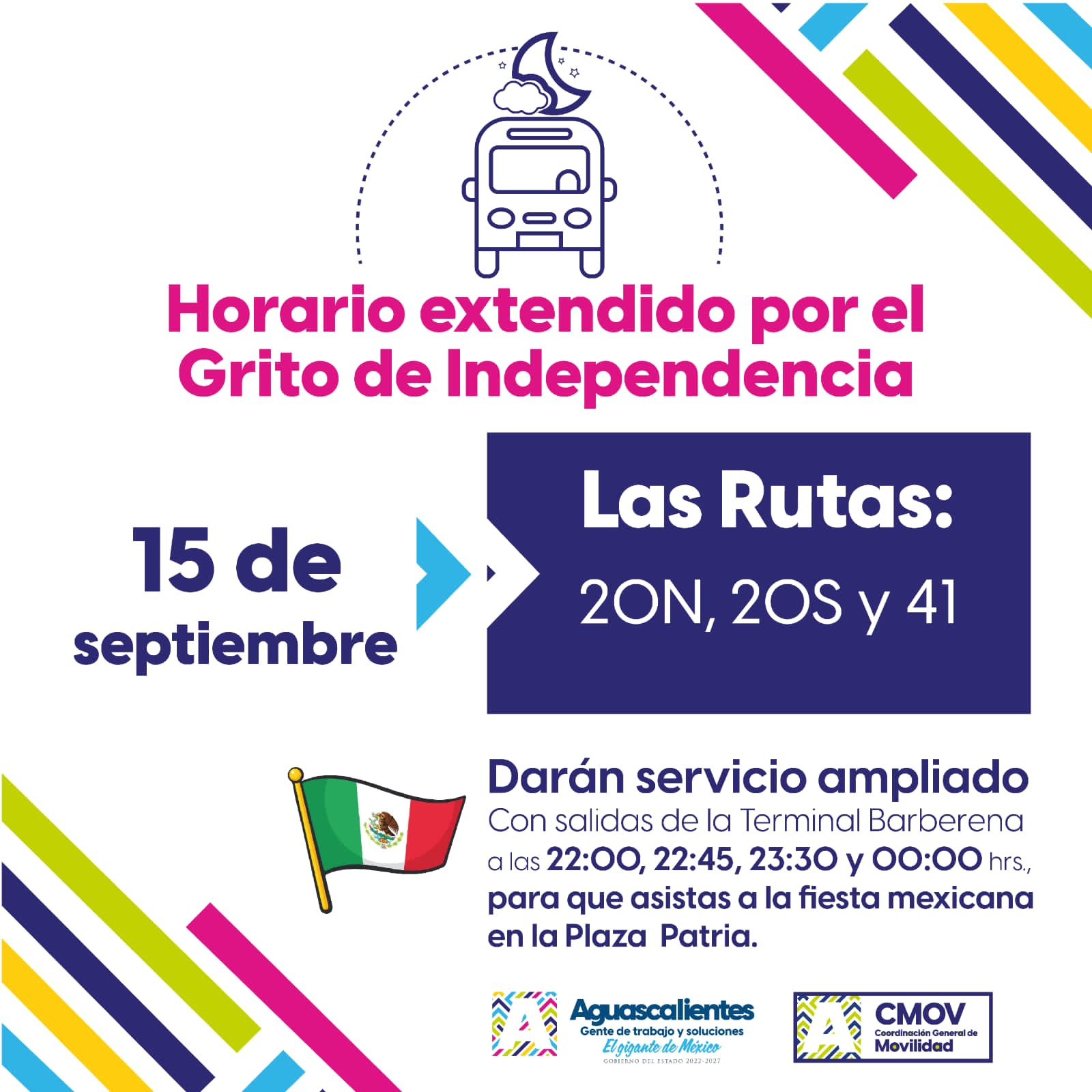 Finalmente, el titular de la CMOV dijo que este servicio especial sólo estará disponible la noche de este viernes 15 y será para que las personas que asistan a las fiestas patrias en el centro de la ciudad, tengan la certeza de que al término de los festejos habrá camiones urbanos y taxis a su disposición para regresar a sus hogares.