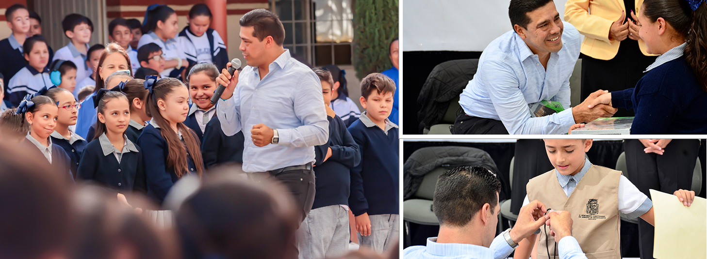 Acompañado por los regidores María Guadalupe Arellano Espinosa y Juan Guillermo Alaniz de León, Leo Montañez entregó tres tabletas a los alumnos Jaime Rivas Elionor, Dylan Emilio Cabrera Hernández y Rogelio Hernández Lozano por ser los alumnos más destacados del plantel educativo, asimismo se entregó material deportivo.