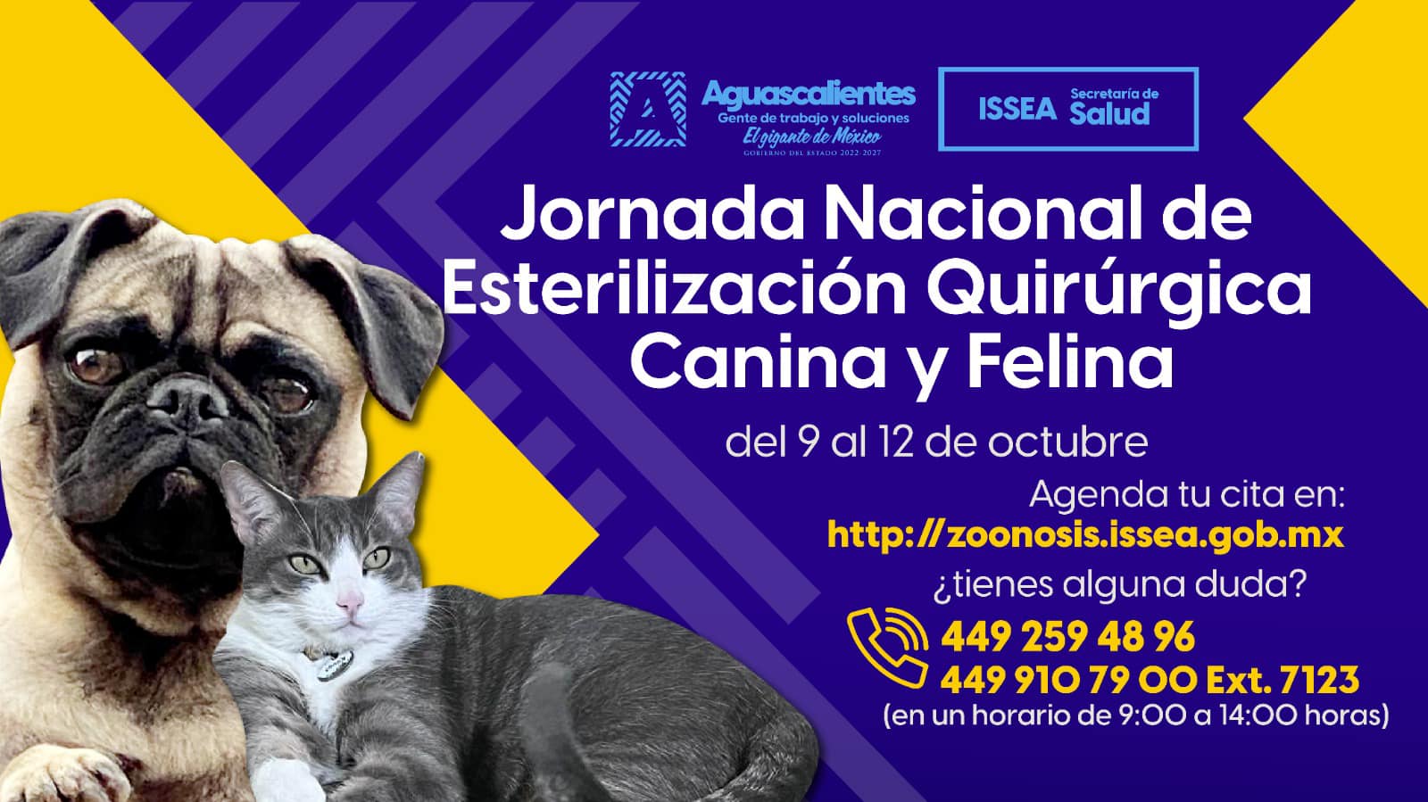 Del 9 al 12 de octubre, tendremos una jornada de esterilización canina y felina en el municipio de Aguascalientes. Haz tu cita a los teléfonos que aparecen en la imagen, de 8:00 a. m. a 3:00 p. m.