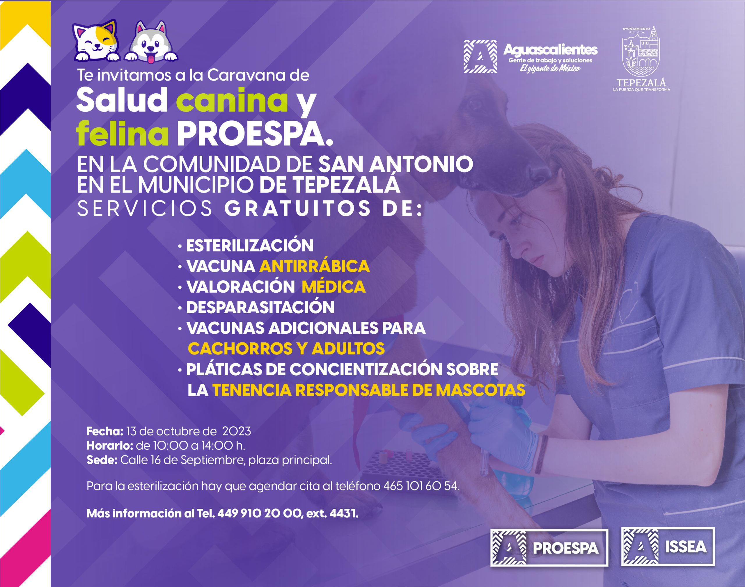 Servicios gratuitos para mascotas, como esterilización, valoración médica, desparasitación, vacunas para cachorros y perros adultos, entre otros, se ofrecerán este viernes 13 de octubre en la comunidad de San Antonio del municipio de Tepezalá.