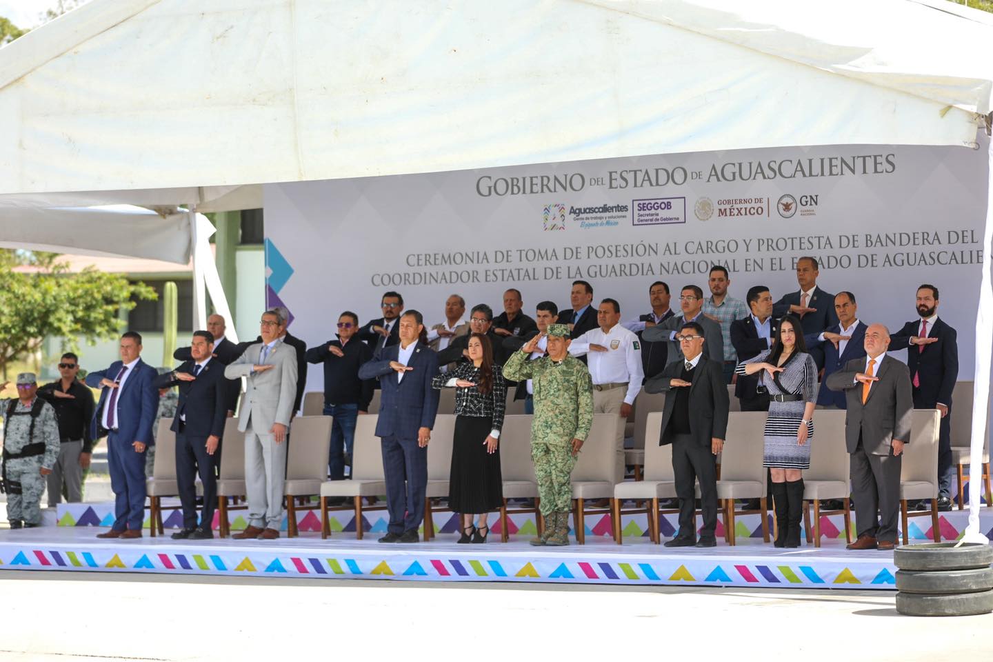 Convencida de que el trabajo coordinado entre todos los niveles de gobierno seguirá posicionando a Aguascalientes como uno de los estados más seguros del país, la gobernadora Tere Jiménez asistió a la toma de posesión al cargo y protesta de Bandera del comisario Leonel Alcaraz Alarcón, como nuevo coordinador estatal de la Guardia Nacional en la entidad.