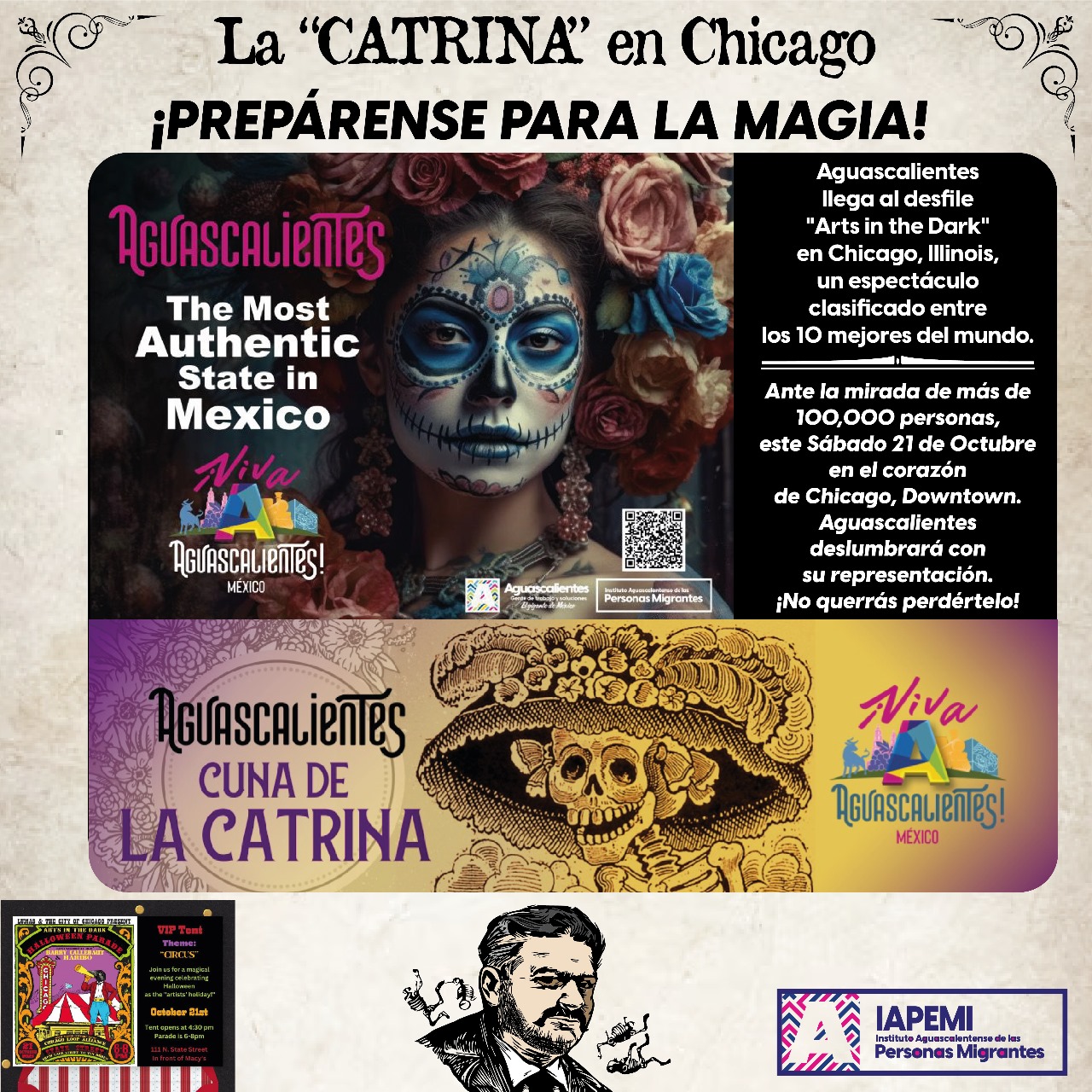 Más de 20 artistas de Aguascalientes viajarán a la ciudad de Chicago, Illinois, para hacer gala de El gigante de México, Guadalupe Posada y su Catrina con el show de mariachi “México Vivo” y la presentación del ballet folclórico “Yetlanezi”, que se llevará a cabo el próximo sábado 21 de octubre en el noveno desfile anual “Arts in the Dark”, donde se celebra Halloween y que reúne a más de 100 mil personas, así lo dio a conocer la titular del Instituto Aguascalentense de las Personas Migrantes (IAPEMI) Natziely Teresita Rodríguez Calzada.
