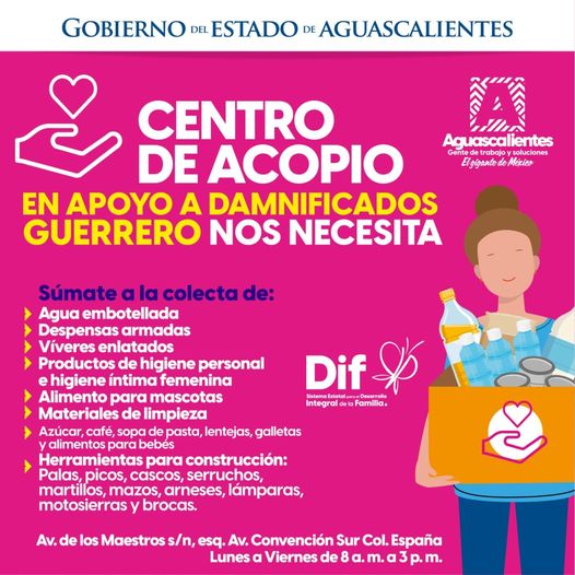 Aguascalientes siempre se ha caracterizado por su solidaridad y por ello requerimos de tu apoyo para enviar ayuda a los damnificados de Acapulco, Guerrero que fueron víctimas del huracán Otis.
