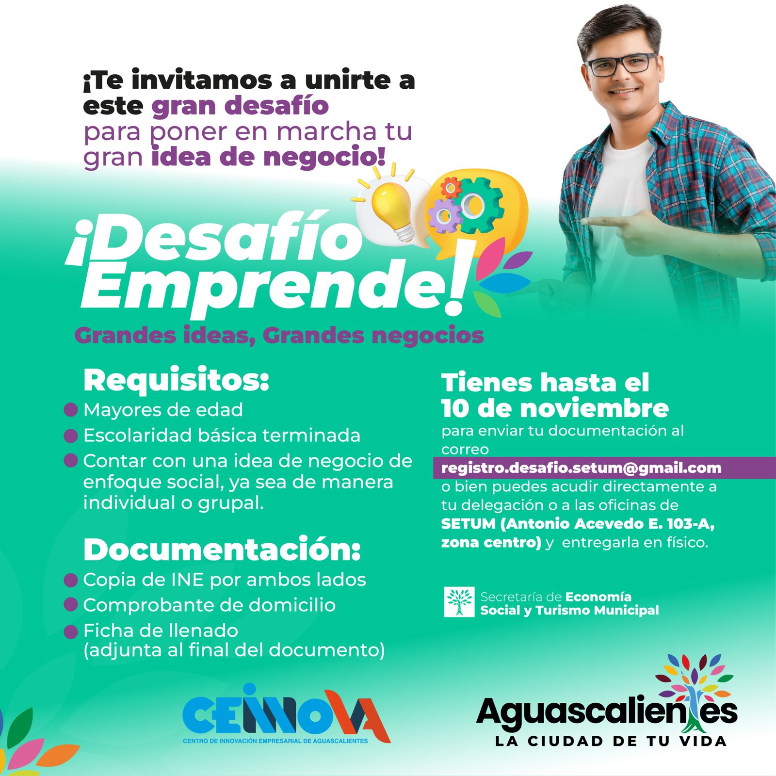 La Presidencia Municipal a través de la Secretaría de Economía Social y Turismo (SETUM), en conjunto con el Centro de Innovación Empresarial de Aguascalientes (CEINNOVA), invitan a los emprendedores locales, a participar en el «Desafío Emprende, ¡grandes ideas, grandes negocios!”, una iniciativa destinada a fomentar el espíritu emprendedor y contribuir al crecimiento de la economía social en nuestra entidad.