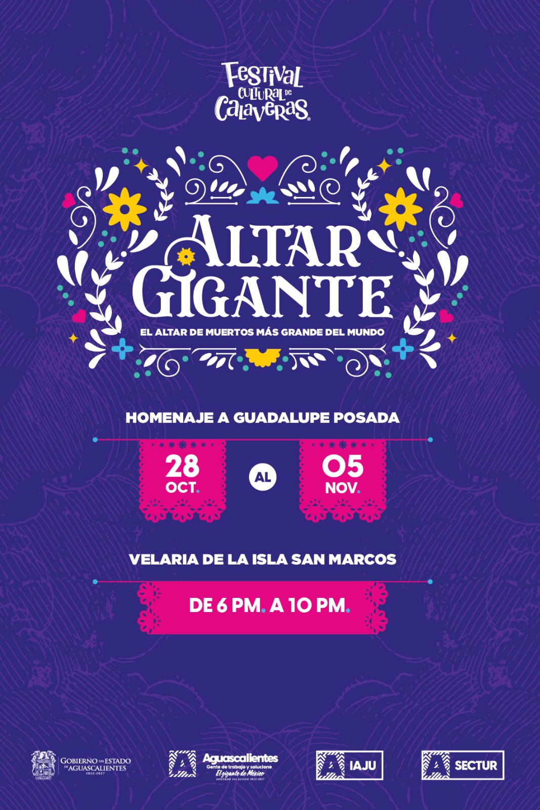 Como parte de las actividades del tradicional “Festival Cultural de Calaveras”, el Instituto Aguascalentense de la Juventud (IAJU) realizará el altar de muertos más grande del mundo en homenaje al artista José Guadalupe Posada, que podrá apreciarse en la Velaria de la Isla San Marcos del 28 de octubre al 5 de noviembre.