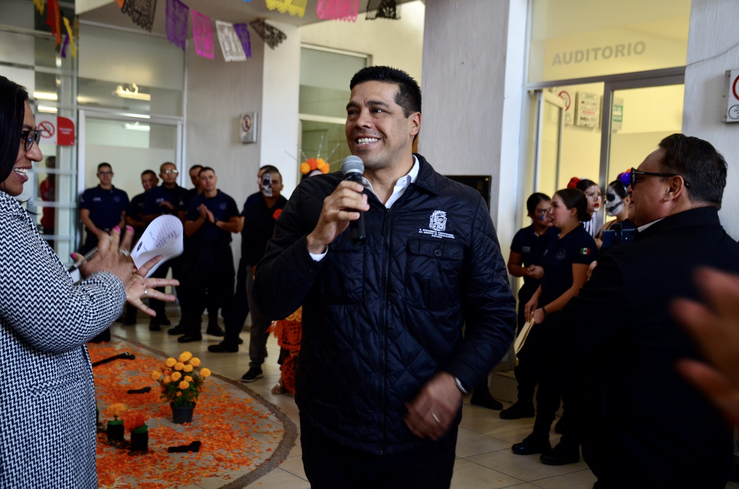 Posteriormente, Leo Montañez acompañado de los regidores Mirna Medina Ruvalcaba y Luis Armando Salazar Mora, así como del secretario de Seguridad Pública Municipal, Antonio Martínez Romo visitaron los altares de muertos elaborados por los cadetes del Instituto Superior en Seguridad Pública.