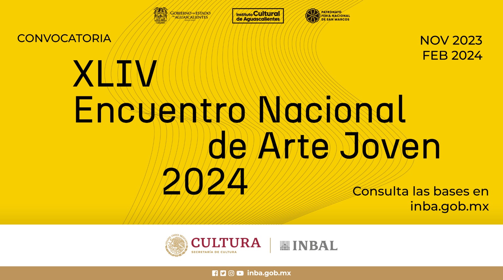 La Secretaría de Cultura y el Instituto Nacional de Bellas Artes y Literatura (INBAL), a través de la Coordinación Nacional de Artes Visuales (CNAV), el Gobierno del Estado de Aguascalientes, el Instituto Cultural de Aguascalientes (ICA) y el Patronato de la Feria Nacional de San Marcos, convocan a artistas mexicanos o extranjeros que residan en el país, a participar en la edición del XLIV Encuentro Nacional de Arte Joven 2024.