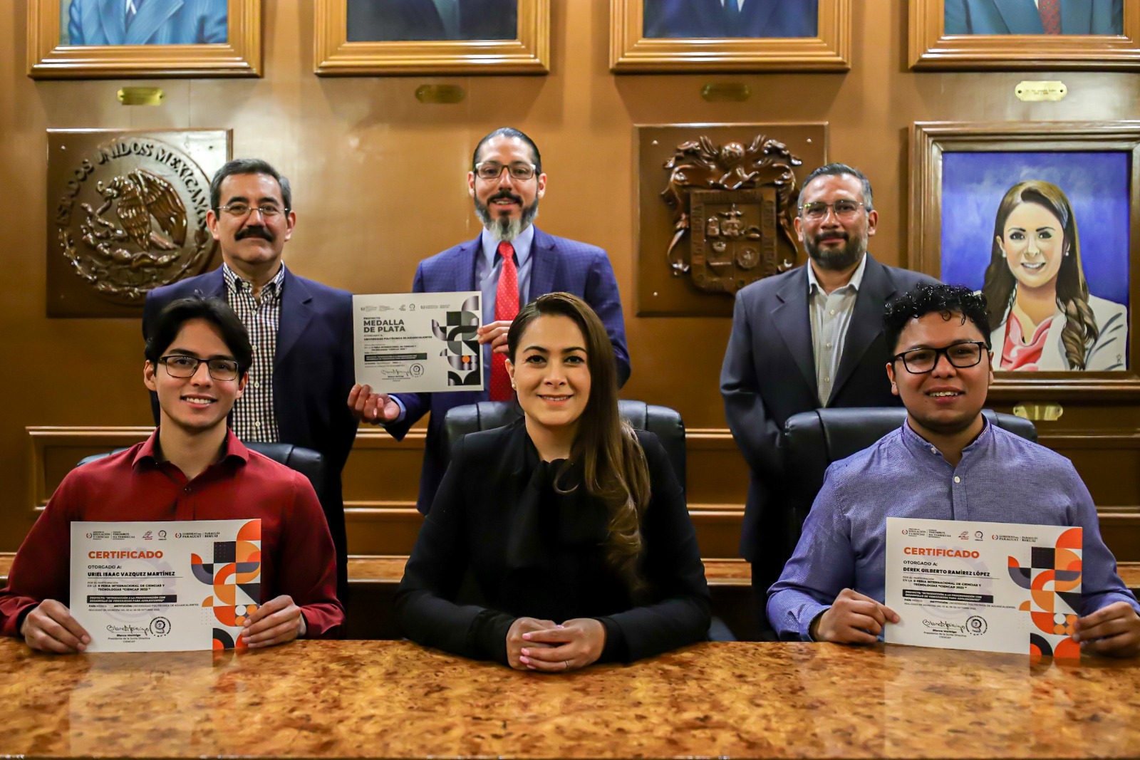 Tras obtener la medalla de plata en la II Feria Internacional de Ciencias y Tecnologías “CIENCAP 2023” que se realizó en Paraguay, estudiantes de la Universidad Politécnica de Aguascalientes (UPA) se reunieron con la gobernadora Tere Jiménez, quien los felicitó y los instó a seguir preparándose para que puedan competir a nivel global y dar soluciones al mundo.