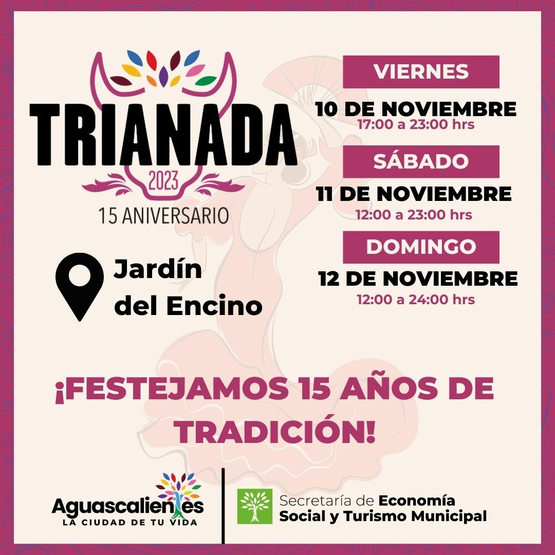 Adriana Marcela Ávila Hernández, coordinadora de la Trianada, comentó que para esta edición especial, se ha preparado un programa lleno de actividades que representan la esencia de este evento, en donde personas de todas las edades podrán disfrutar de eventos culturales y gastronómicos, como baile flamenco, trajes típicos españoles, suelta de novillos, actividades para niños, cata de vinos hidrocálidos, paella gigante y música a cargo de Fuente y Caudal, Cuatro por Cuatro y Barrio Gitano.