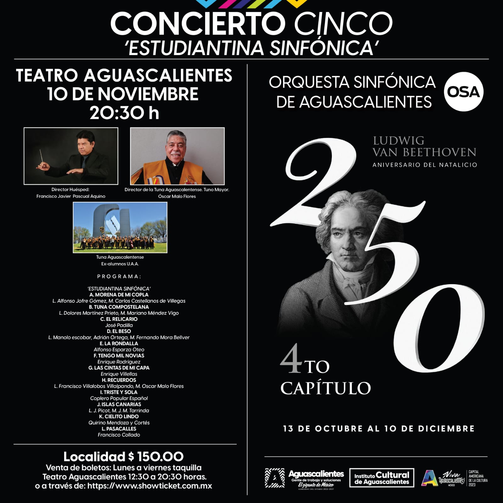 Las y los asistentes podrán disfrutar de una inolvidable noche en la que las letras de la estudiantina serán acompañadas por la OSA con la participación del director invitado Francisco Javier Pascual Aquino y del director de la Tuna Aguascalentense, el Tuno Mayor Óscar Malo Flores.