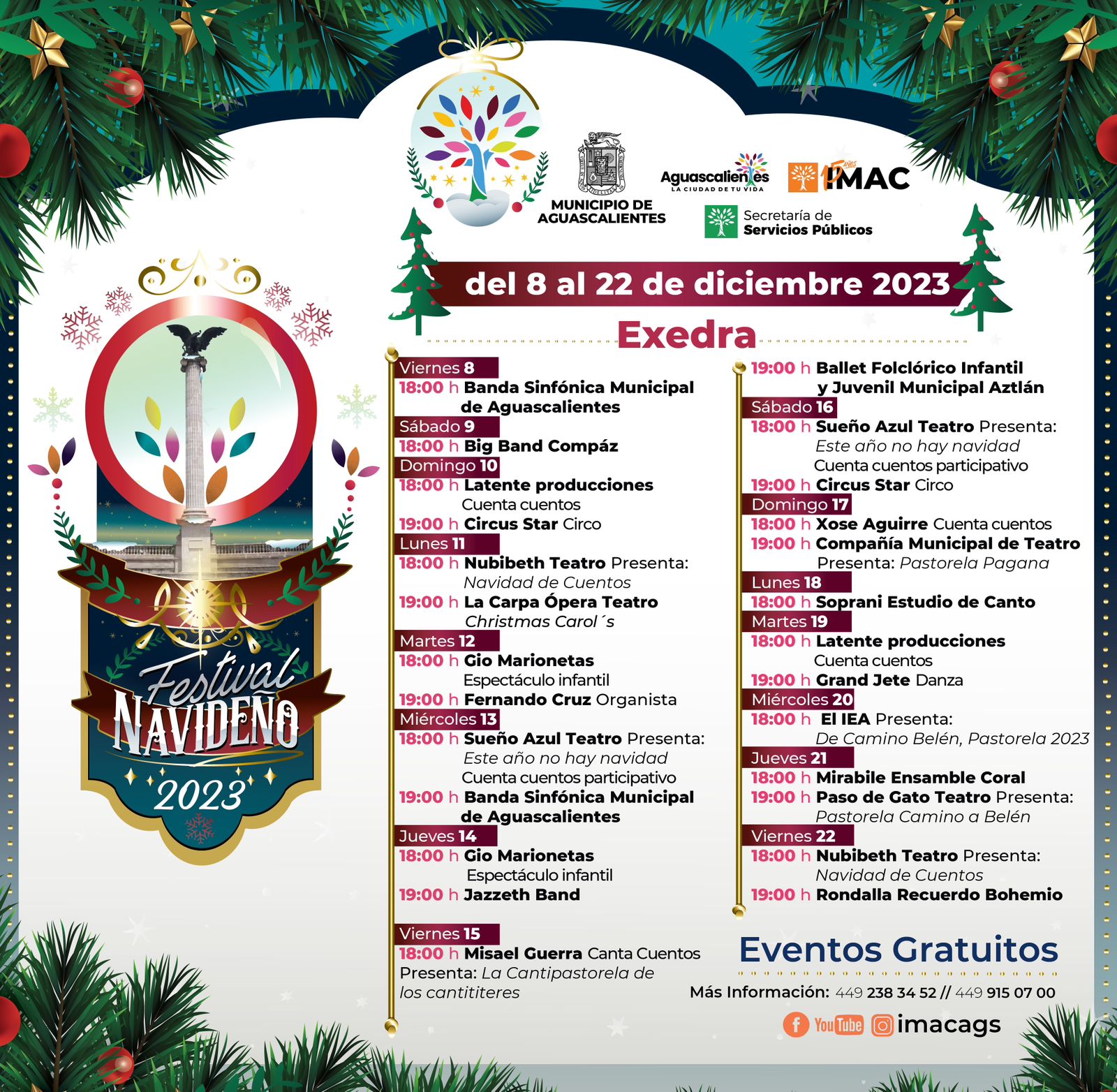 El Municipio de Aguascalientes, realizará por segundo año consecutivo el Festival Navideño, el cual se llevará a cabo del 8 al 20 de diciembre en la Exedra de la Plaza de la Patria, en donde las familias podrán disfrutar de actividades gratuitas como pastorelas, villancicos, cuenta cuentos, conciertos, talleres de iniciación artística y del talento de artesanos locales.