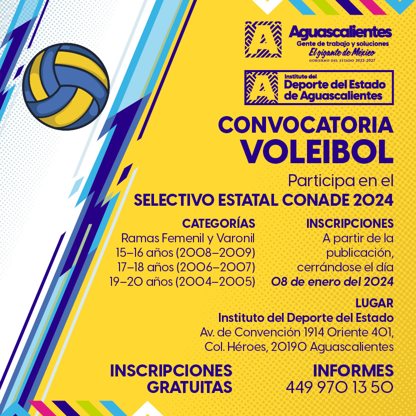 El Instituto del Deporte del Estado de Aguascalientes (IDEA) se complace en anunciar la apertura de la convocatoria para aquellos atletas de voleibol que deseen formar parte de la selección estatal y representar a nuestra entidad en los próximos Juegos Nacionales Conade 2024.