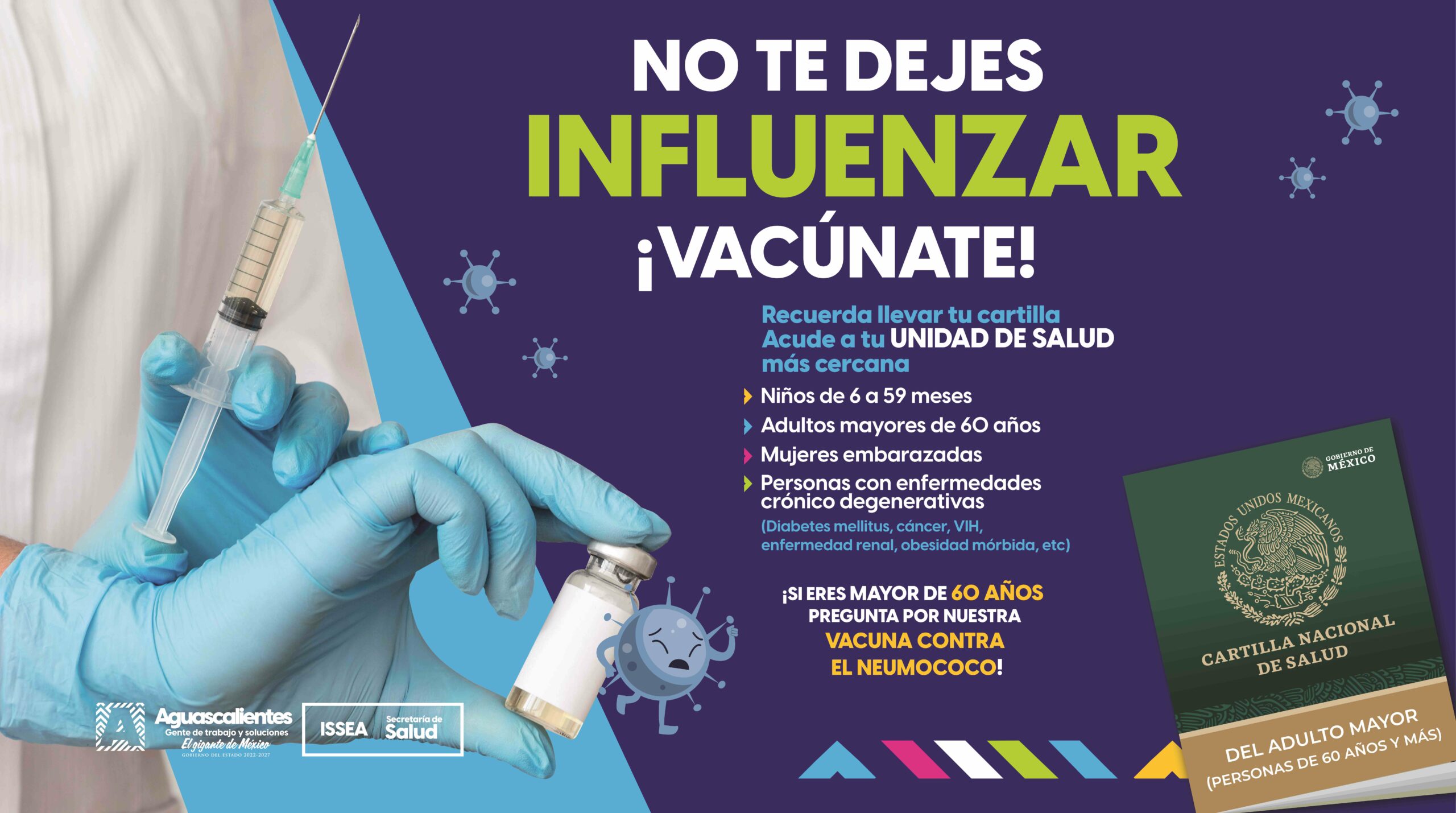 La Secretaría de Salud del Estado (ISSEA) invita a la población a vacunarse contra la influenza, especialmente los grupos de riesgo como niñas y niños menores de cinco años, adultos mayores de 60 años, mujeres embarazadas y personas con enfermedades crónico-degenerativas; las y los interesados en aplicarse el biológico, deberán acudir a su Centro de Salud más cercano de las 9:00 a las 13:00 horas.