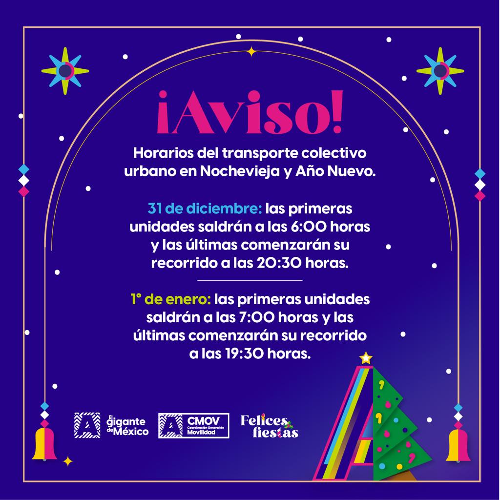 La Coordinación General de Movilidad informa que en Nochevieja y Año Nuevo sí habrá servicio de transporte colectivo urbano, con algunas modificaciones en los horarios de los camiones los días 31 de diciembre y 1° de enero.