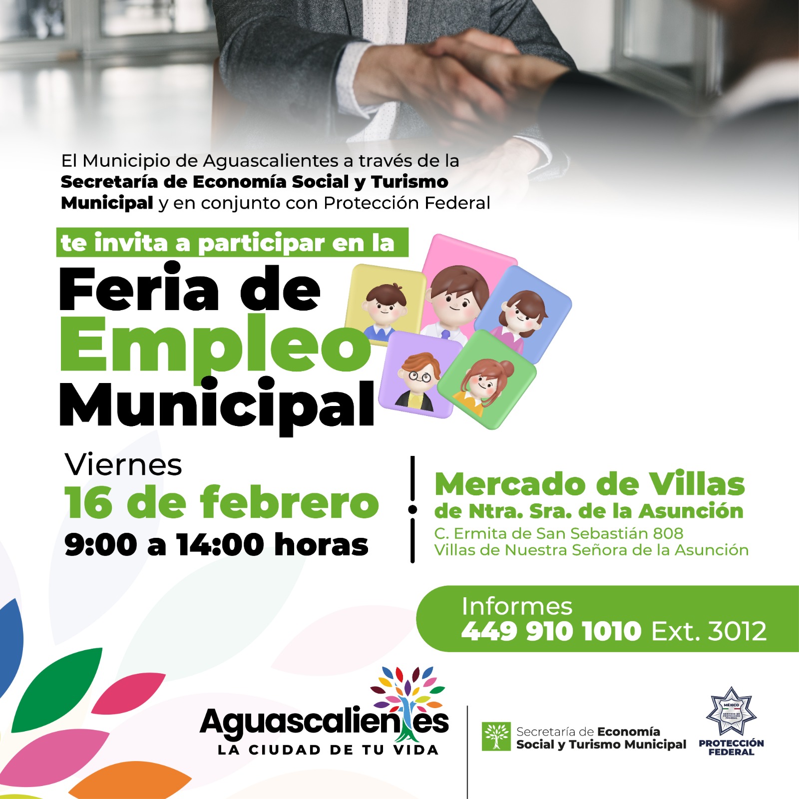 Por otra parte, el martes 27 de febrero se llevará a cabo la segunda Feria de Empleo en el auditorio del Instituto Municipal de Salud Mental (IMASAM), ubicado en Av. Poliducto, Fracc. Mujeres Ilustres, con un horario de 9:00 a.m. a 2:00 p.m. Participarán 20 empresas con vacantes en diversos puestos y salarios que van desde los $4,800 hasta los $30,000 pesos mensuales. Entre las empresas invitadas se encuentran Grupo CCA, Cerveza Corona en Aguascalientes, Red Siglo XXI, Omnibus de México, Del Sol, CNC, Hecort, Kitagawa, Sistemas de Arneses, Lala, OXXO, Freasa, Gas Imperial, entre otras.