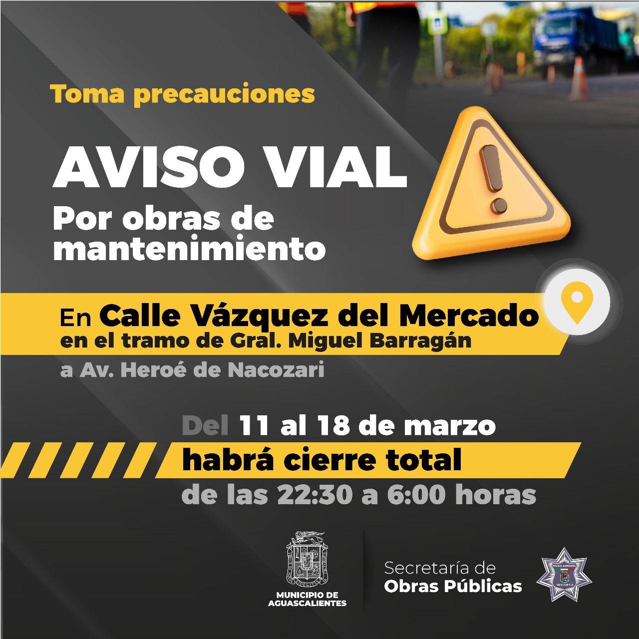 El Municipio de Aguascalientes informa que del 11 al 18 de marzo se realizarán cierres viales sobre la calle Vázquez del Mercado, en el tramo comprendido entre Barragán y Av. Héroe de Nacozari, en la Zona Centro, debido a trabajos de rehabilitación de la carpeta asfáltica.