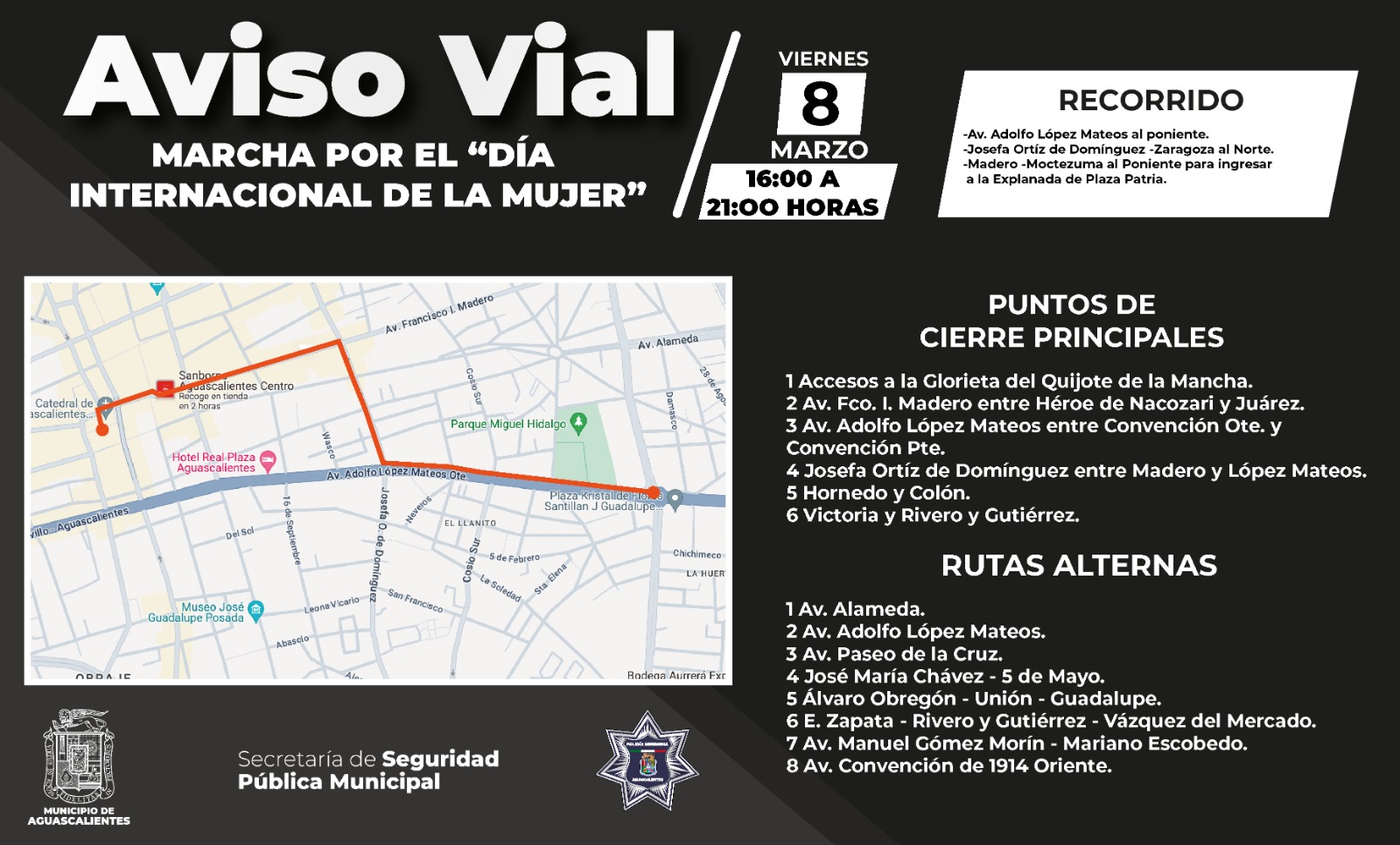La Secretaría de Seguridad Pública Municipal (SSPM) de Aguascalientes informó que activará un operativo especial con motivo de la marcha por el Día Internacional de la Mujer.