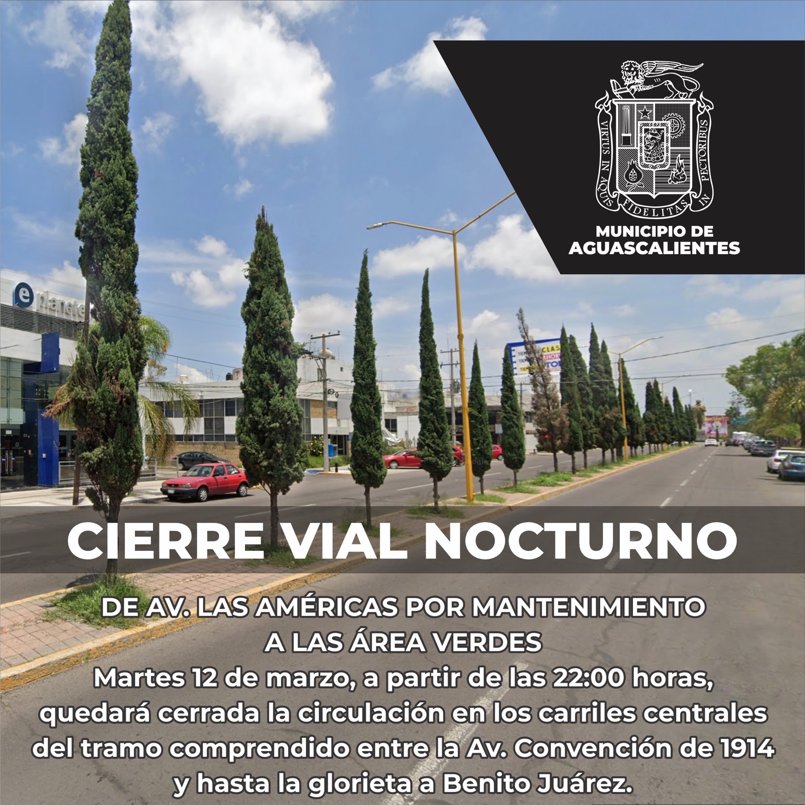 La Secretaría de Servicios Públicos informó que este martes 12 de marzo, a partir de las 22:00 horas, quedará cerrada la circulación en los carriles centrales del tramo comprendido entre la Av. Convención de 1914 Sur y hasta la glorieta a Benito Juárez, para realizar podas de los árboles y retiro de ramas.