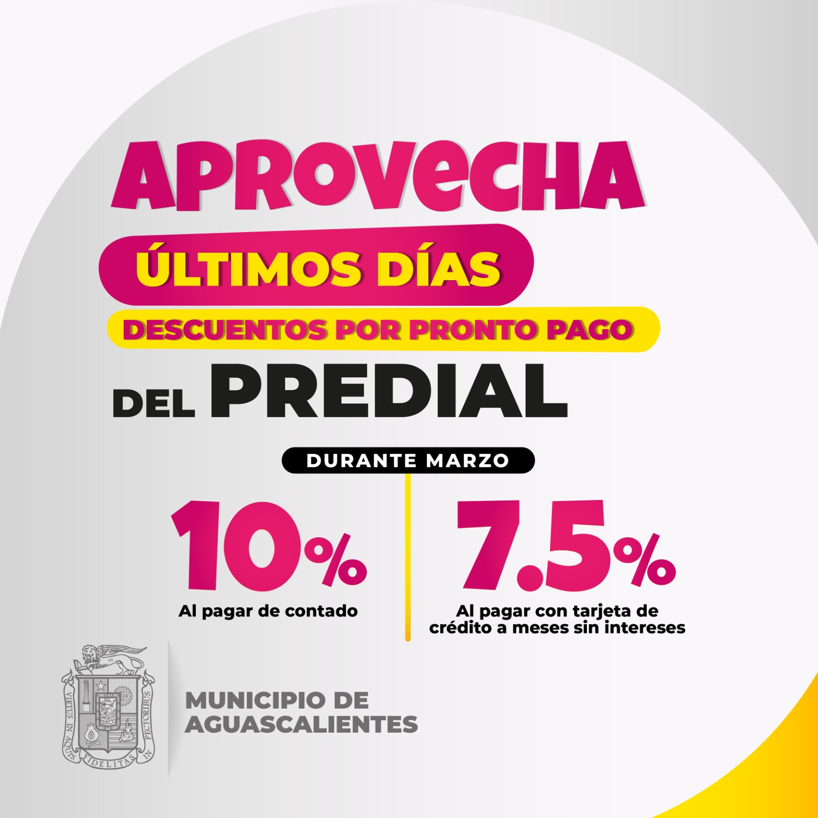 El Municipio de Aguascalientes a través de la Secretaría de Finanzas, invita a la ciudadanía a aprovechar el descuento del 10 por ciento por pronto pago en el predial 2024, así como el descuento del 7.5 por ciento al pagar con tarjeta de crédito a meses sin intereses, que finalizan el 31 de marzo.