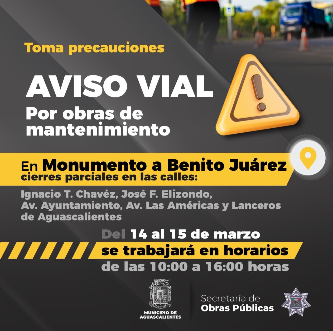 El Municipio de Aguascalientes, a través de la Secretaría de Obras Públicas Municipales, dio a conocer los cierres viales parciales de las calles Ignacio T. Chávez, Av. Las Américas, Lanceros de Aguascalientes, Av. Ayuntamiento y José F. Elizondo, que convergen en la Glorieta del Monumento a Benito Juárez, para llevar a cabo trabajos de bacheo intensivo.