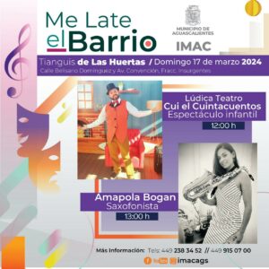 El Instituto Municipal Aguascalentense para la Cultura (Imac) invita a la ciudadanía a participar en las actividades “Me Late el Barrio” que como parte del esquema itinerante, se presentará este domingo 17 de marzo en el tianguis que se instala en Las Huertas.