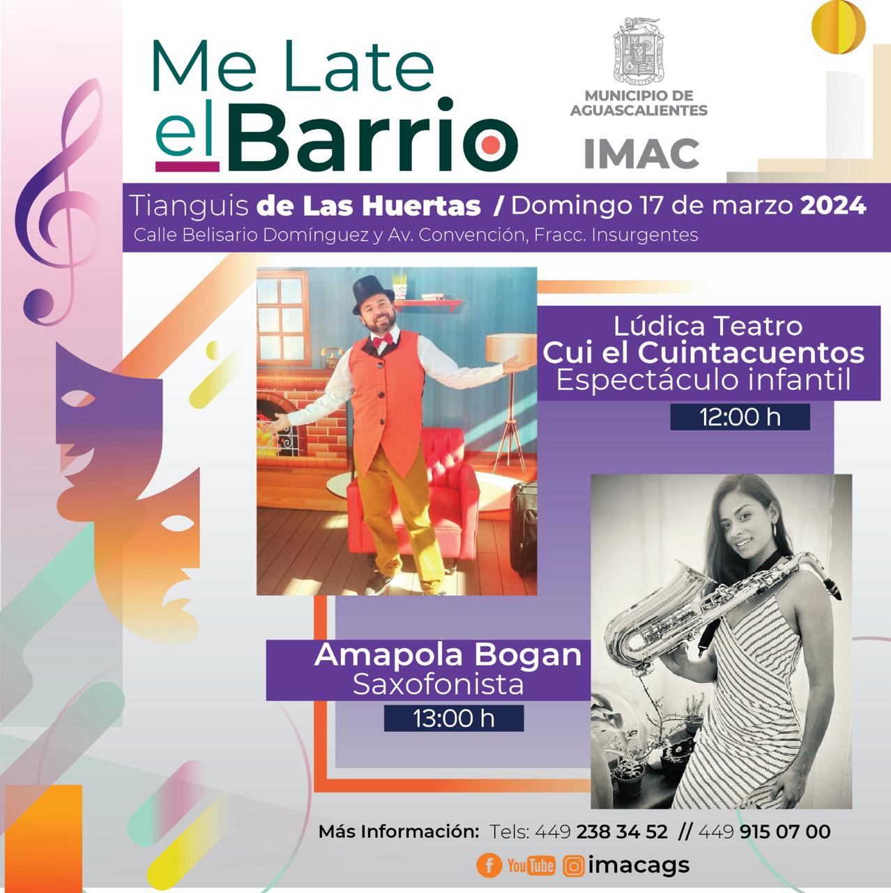 El Instituto Municipal Aguascalentense para la Cultura (Imac) invita a la ciudadanía a participar en las actividades “Me Late el Barrio” que como parte del esquema itinerante, se presentará este domingo 17 de marzo en el tianguis que se instala en Las Huertas.
