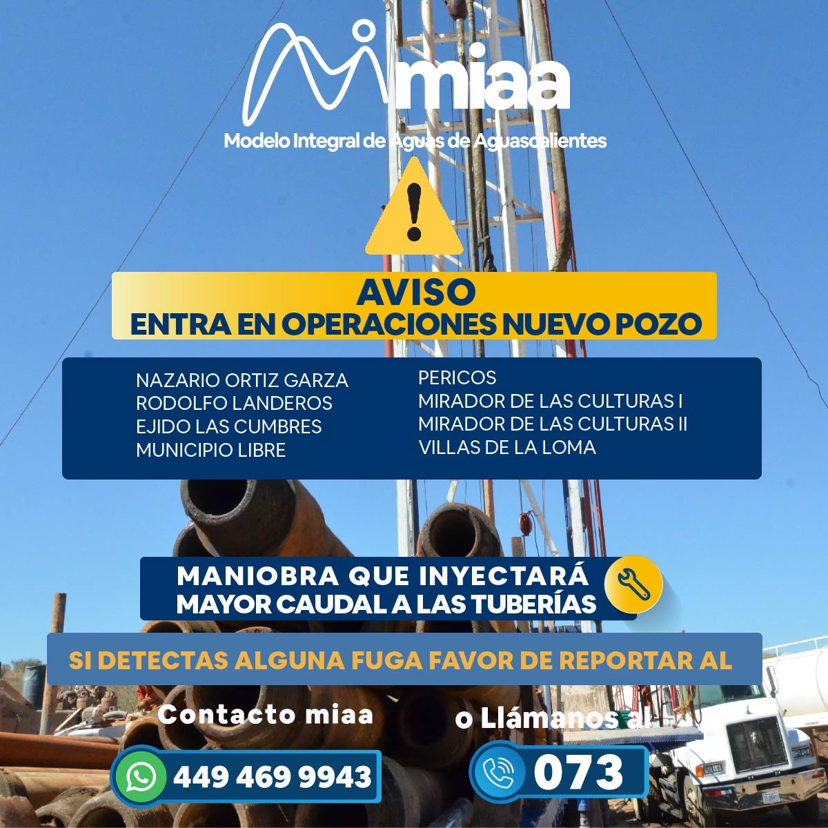 Cabe destacar que en próximas horas podrían presentarse fugas derivado del aumento de presión en las tuberías, por lo que se agradece reportar cualquier situación al número 449 469 99 43 o al 073.