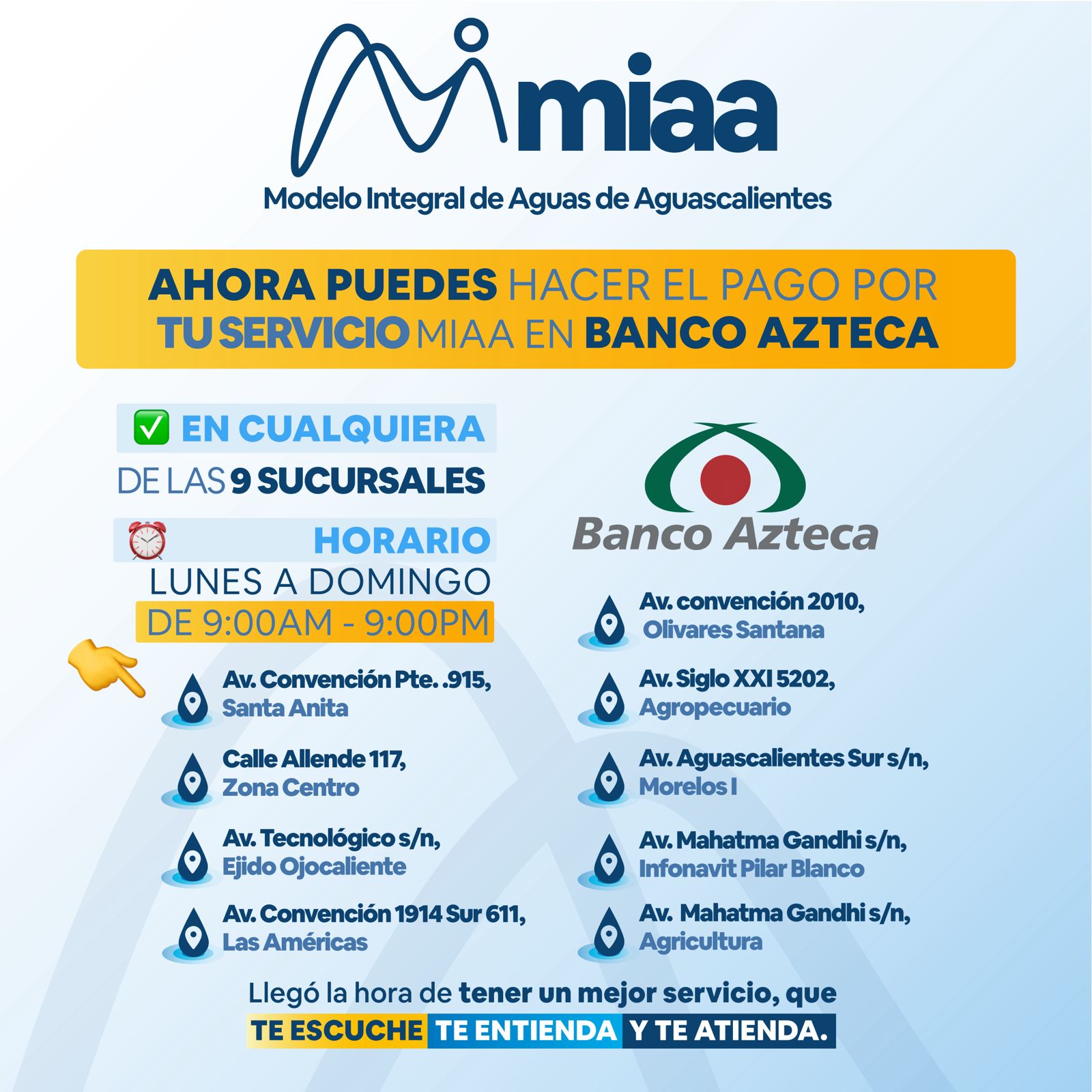 El Modelo Integral de Aguas de Aguascalientes (MIAA) informa a las y los usuarios que ahora pueden pagar su estado de cuenta en Banco Azteca.
